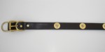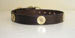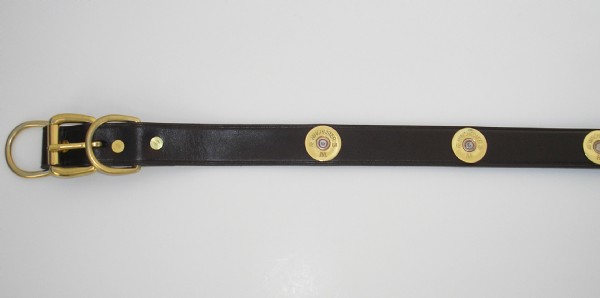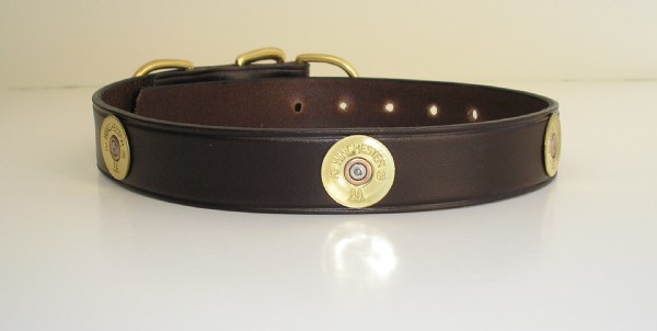 Authentic recycled/spent 12 Ga ShotShells around a Leather Collar; these are genuine Winchester Shotshells, polished, with a Solid Brass Roller Buckle and Brass D ring. Color: Deep Mahogany. 5 sizes available. Made in USA** Collars Measure in inches from the leather strap at the buckle end to the middle hole of a 5 hole punch.