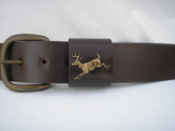 Hand Fashioned from full grain English Bridle Leather. Brass Running Buck Ornament is on the Keeper; Buckle is Solid Brass 1 1/2 inch width, even sizes 30-68. Leather Color is Deep Mahogany. Made in USA**