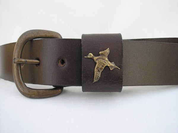 Hand Fashioned from full grain English Bridle Leather. Authentic Brass Casting by Wildlife Artist Sid Bell is on the Keeper; Buckle is Solid Brass, Antique Finish, 1 1/2 inch width, even sizes 32 to 68. Leather Color is Mahogany Brown. Made in USA**