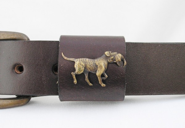 Made of full grain English Bridle Leather with an authentic Brass Casting of a Retriever with a Duck by Wildlife Artist Sid Bell on the Keeper; Buckle is Solid Brass, Antique Finish, 1 1/2 inch width, even sizes 32-68. Leather Color is Mahogany Brown. Made in USA**