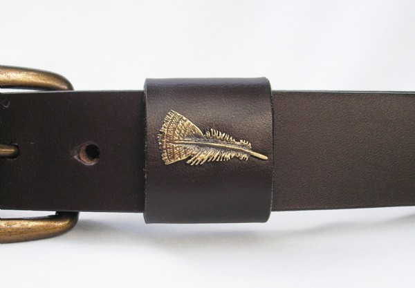 Made of full grain English Bridle Leather with an authentic Brass Casting of a Turkey Feather by Wildlife Artist Sid Bell is on the Keeper; Buckle is Solid Brass, Antique Finish, 1 1/2 inch width, even sizes 32 to 68. Leather Color is Mahogany Brown. Made in USA**