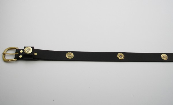 For the Youngster; even sizes 22 to 28. Sporting Leather Belt with Authentic Recycled Spent Polished 12 Ga Shot Shell Cap on the Keeper plus 3 Shells on the Leather Strap. The Buckle is Solid Brass, Polished and Lacquered. 1 1/4" in width. Leather Color is Deep Mahogany. Made in USA**