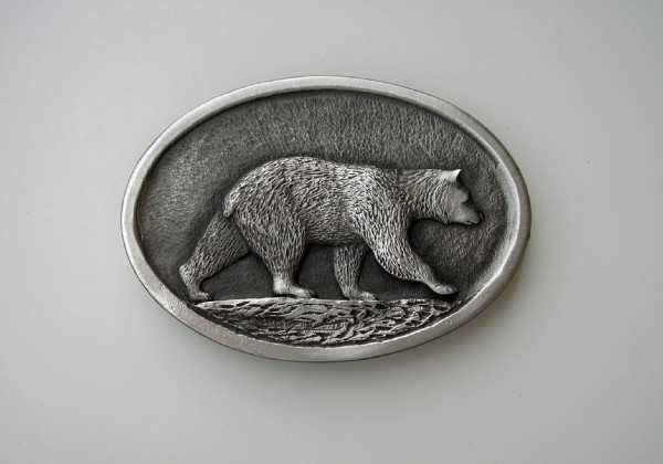 Pewter Cast Buckle of a Bear Walking by Pilgrim Pewter design copyright by Sid Bell Originals. Measures 3 1/4" x 2 1/2". Non Lead Pewter with 1 1/2" wire loop on buckle. Made in U.S.A.***