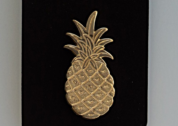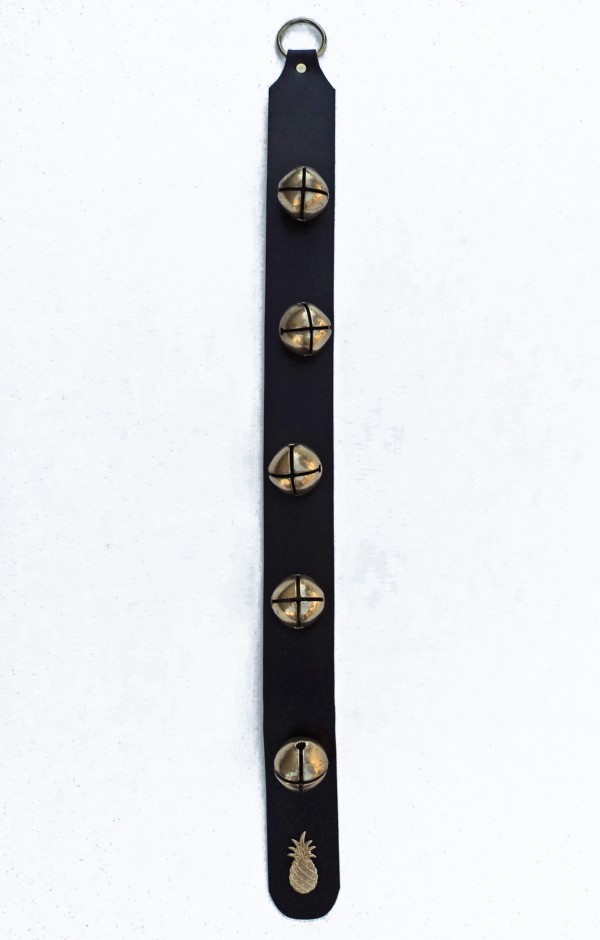 Holiday Bells: 5 Solid Brass Bells hand tied on Genuine Leather Strap with Brass Pineapple Ornament. Measures 2" wide x 26 3/4" long. Leather is Deep Mahogany Brown in color.